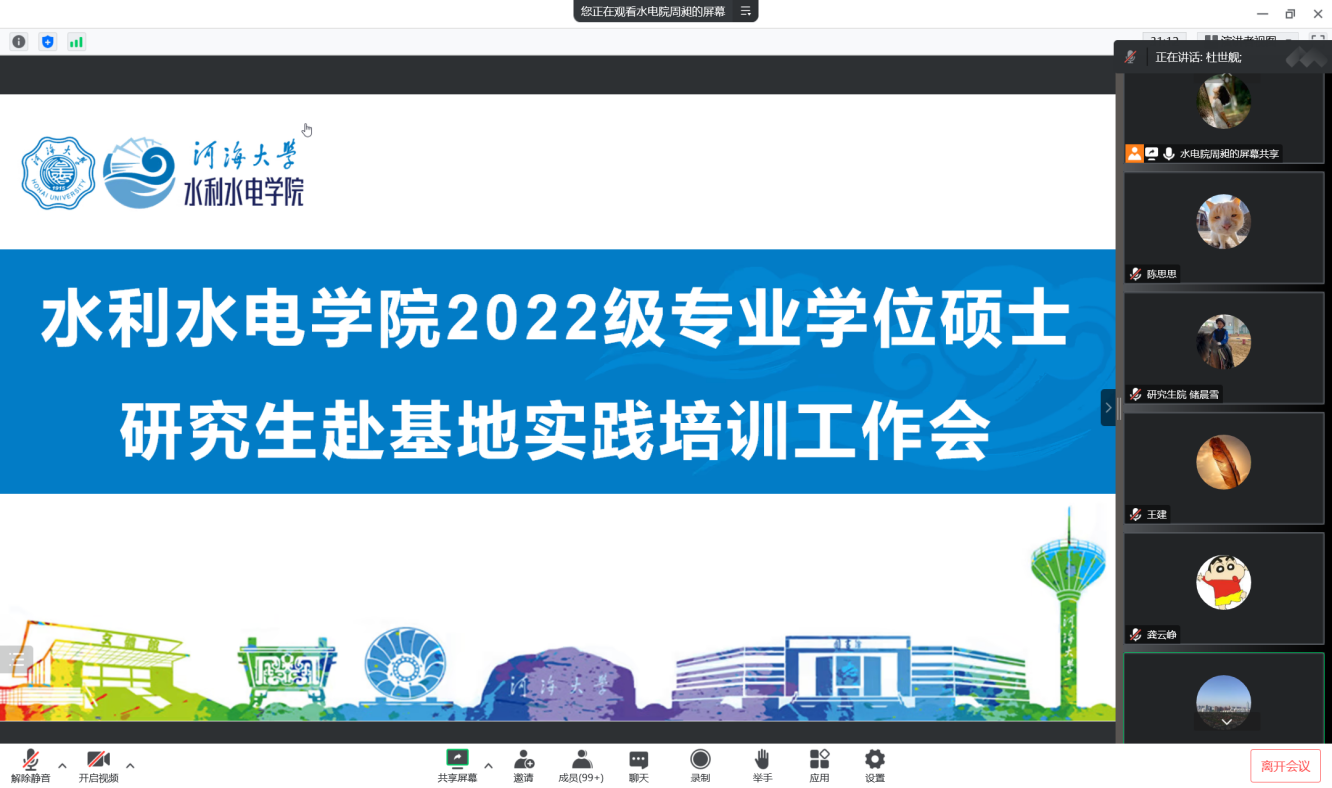 研究生工作部杜世舰副部长叮嘱同学们在基地要服从安排和管理,对实践环境要做好相应准备,积极与校内导师联系。同时提出三点建议:一是要有清晰认识,顶岗实践有别于普通实习,因此要与老师、前辈多交流,以优异的成绩顺利完成实践;二要维护河海大学的荣誉,要认真实践、努力工作、开拓进取,充分体现河海人的过硬素质和优良作风;三要珍惜此次实践机会,做基地与学校联系的桥梁和纽带,充分利用河海大学研究生和“基地单位员工”的双重身份积极培养职业能力,保质保量完成个人实践任务。