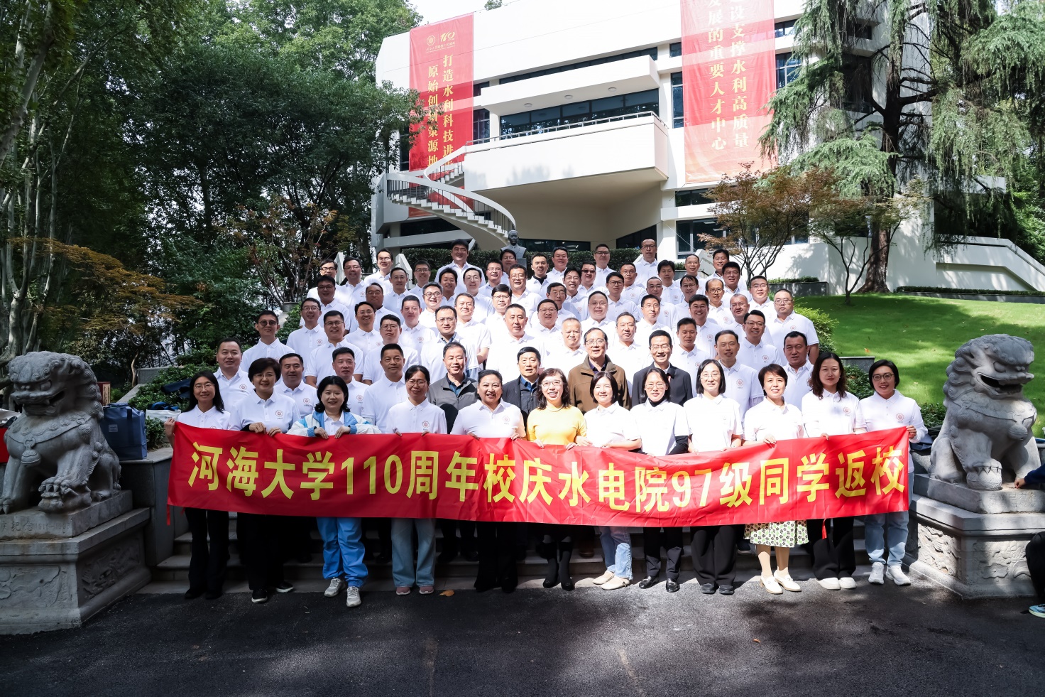 座谈会接近尾声,全体师生与校友移步科学馆前拍照合影。“我饮河海一滴水,我献祖国一生情!”伴随着响亮的口号,相机快门按下,将二十八载重逢的喜悦、对母校百十华诞的祝福,永远定格在这一温馨瞬间。二十八载岁月变迁,水电97级校友们虽分散各地、从事不同领域工作,但“艰苦朴素、实事求是、严格要求、勇于探索”的河海精神始终未变。从母校出发,他们将个人理想融入国家水利事业发展,在江海湖畔书写着属于河海人的担当与奉献。