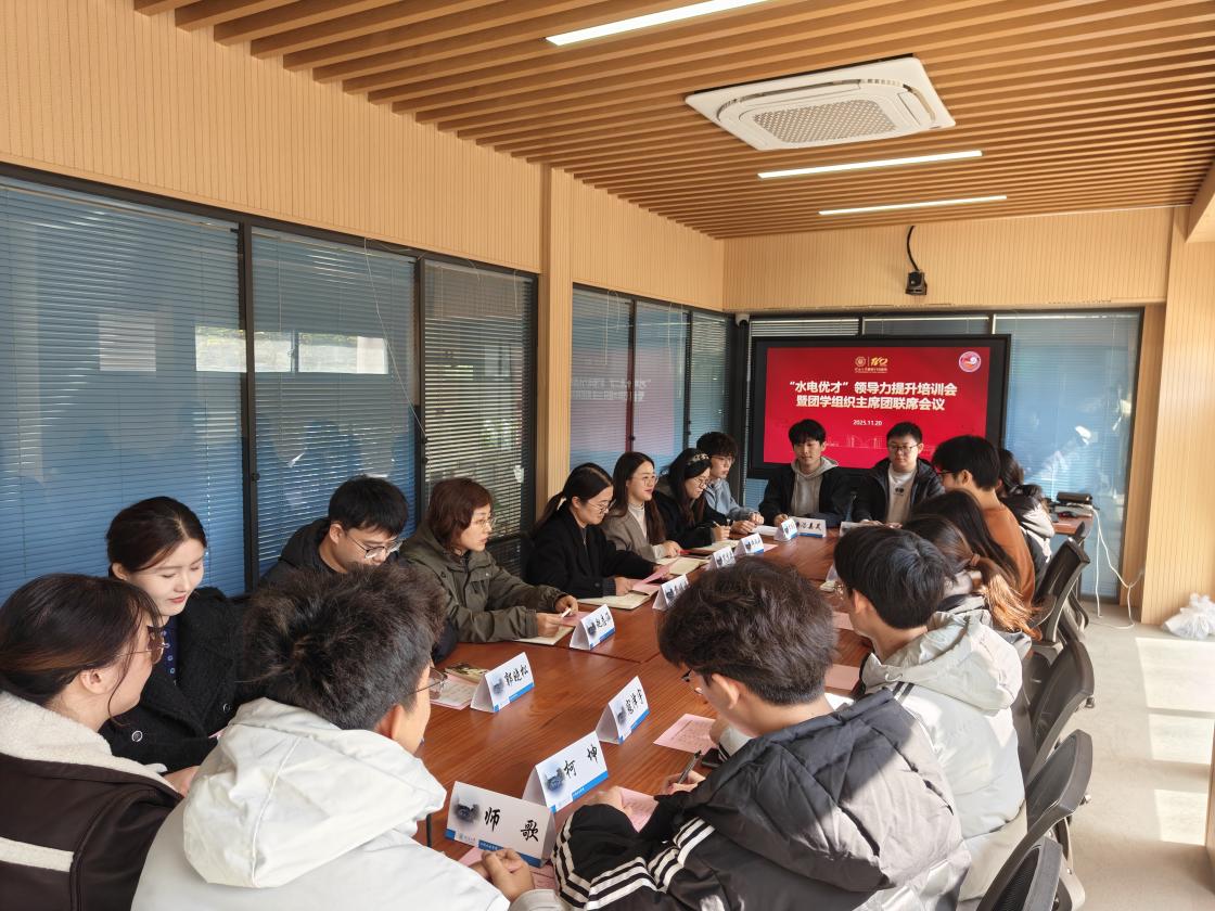 为进一步加强我院学生骨干队伍建设,提升各团学组织负责人的领导能力与综合素质,促进各组织间的协同联动与工作交流,11月19日,我院召开2025年“水电优才”领导力提升培训会暨团学组织主席团联席会议。学院党委副书记戴媛媛、院团委书记笪步源、2023级本科生辅导员帅雨婷、研究生辅导员赵志涵出席会议,院团委、学生会、研究生会、学生科协、青协、传媒中心主席团成员共同参加。