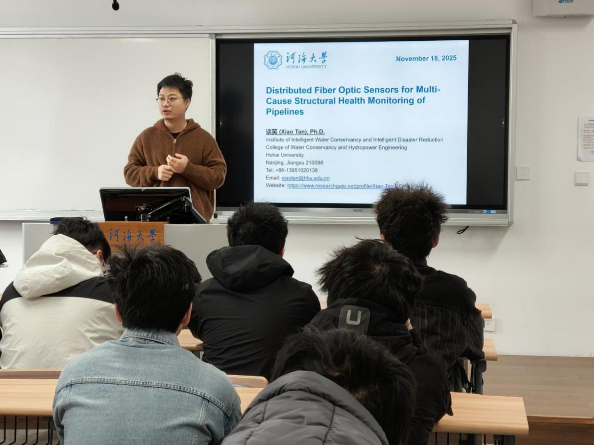 2025年11月18日,我院安全工程系副系主任谈笑在常州校区2号楼A207教室主讲《基于分布式光纤传感器技术的管道多因素结构健康监测》专题学术讲座。2024级安全工程一班全体同学参加本次讲座,讲座旨在搭建学术前沿与专业学习的桥梁,助力学生深化对安全工程领域核心技术的认知。
