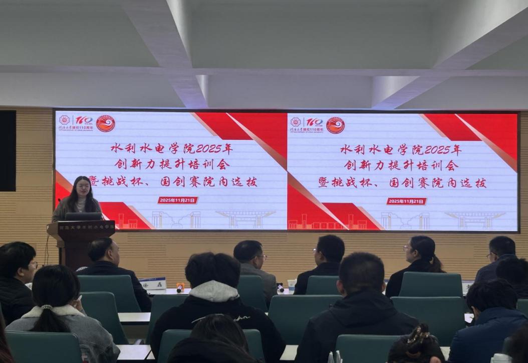 为进一步营造学院创新创业氛围,提升学生创新创业实践能力,11月21日,皇冠体育官网举办创新力提升培训暨第十五届“挑战杯”中国大学生创业计划竞赛院内选拔赛。双创学院副院长、校团委副书记房阔、皇冠体育官网副院长俞晓东、党委副书记戴媛媛、水利水电工程系主任徐磊、商学院袁猛出席并担任评委,学院创新创业导师代表、项目指导老师、备赛团队及团学组织骨干参加,活动由院团委书记笪步源主持。