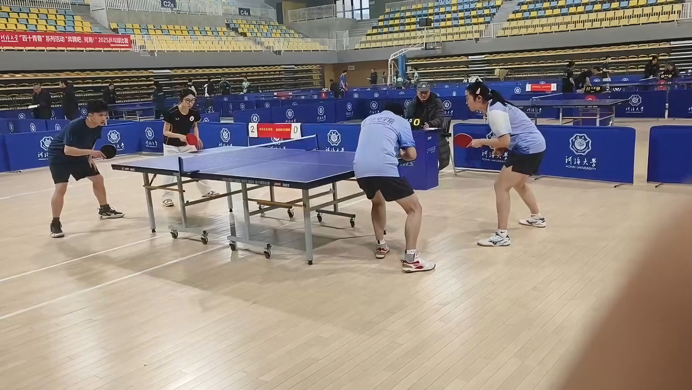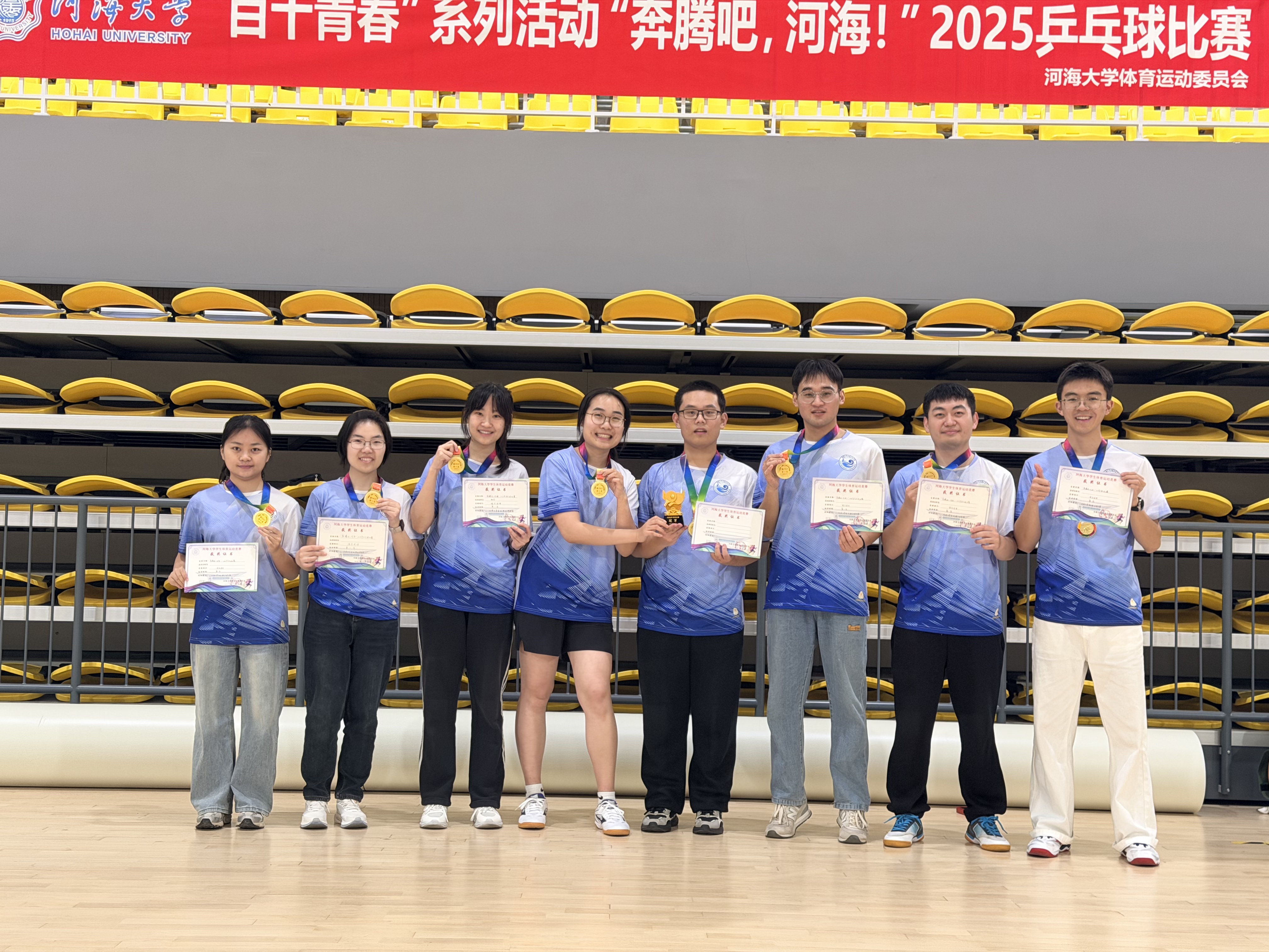 12月20日,“奔腾吧,河海!”2025年乒乓球比赛在常州校区体育馆火热开展。赛前通过院内选拔,我院本科生郭轩毓、研究生赵旭、张姚、王岩博、邢容、戴诗菡、李奕函、彭小倩作为队员参赛,经过一天的激烈竞争,我院乒乓球队员们斗志昂扬,一路披荆斩棘,成功卫冕夺冠。