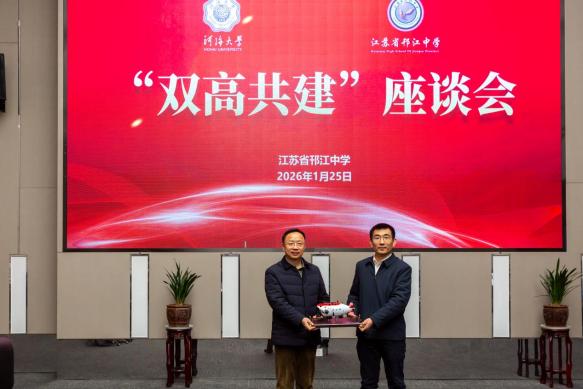 “双高共建”座谈会上,双方围绕优质生源输送、育人资源共享、协同模式创新等深入交流。宋翔洲副校长介绍了河海大学的办学特色、学科优势及人才培养成果。他代表学校向江苏省邗江中学赠送喜报、捐赠“蛟龙号”合金模型,彰显两校在科学精神与文化传承上的深度共鸣。陈军副校长详细介绍了江苏省邗江中学的办学规模及特色、人才培养成果及高三学子升学概况,深切表达了与河海大学深化合作、共促学生成长的殷切期望。